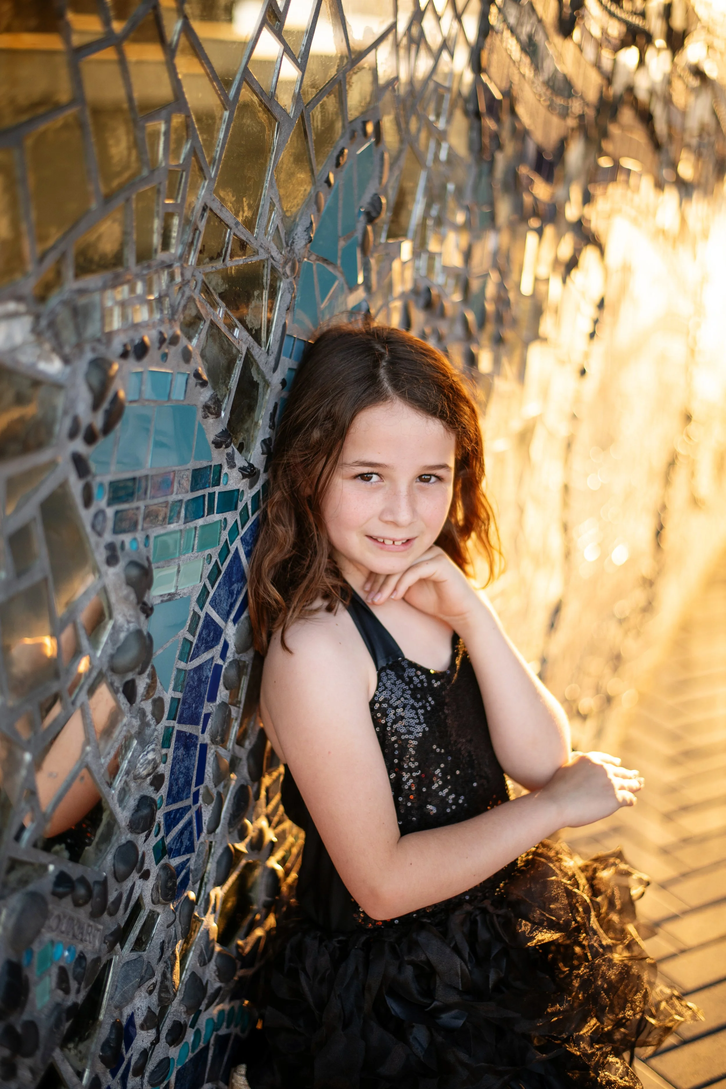 The park also features a colorful mosaic wall that adds a fun and vibrant pop of texture to photos, along with the fountain area, which creates a classic and elegant setting for portraits.